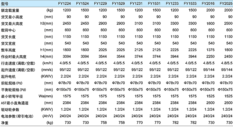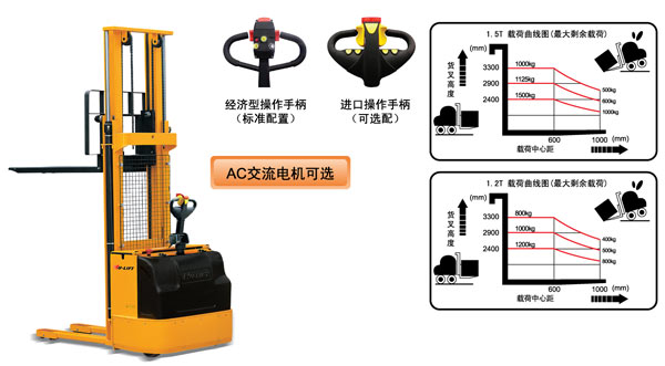 ● 獨特的雙油缸設計.增強載重能力的同時提高了視野寬度 ● 采用進口泵站,使貨物起升平穩有力 ● 進口驅動輪,配置可靠的盤式剎車系統,動力強勁,性能穩定 ● 進口電控系統反應靈敏.操作自如 ● 大容量牽引電池,充電方便快捷,電量持久,帶電量顯示表,低電壓報警燈 ● 特殊軋制工藝制造的“C”型鋼門架,堅固安全 ● 帶有低電壓保護功能,在蓄電池電壓短時間低于規定電壓時,低電壓保護功能可保證電池及電器元件的安全。 ● 符合歐洲EN1757-1:2001,ENl727標準 ● 必須嚴格按照堆高車的載荷曲線圖中所允許的剩余載荷進行操作,嚴禁超載使用,確保安全