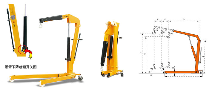 ● 重載設計,高品質的快起升油缸,省時省力 ● 根據需要.吊臂可三個工位調節 ● 鍛造重載可旋轉吊鉤 ● 出廠前125%過載測試,保證安全使用 ● 符合歐洲CE安全標準